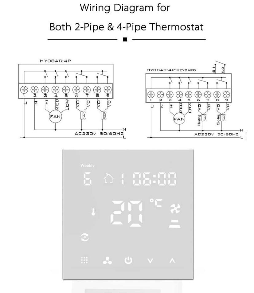 Λειτουργεί με σύνδεση 3/4 καλωδίων, υποστηρίζει Fan Coil 2 ή 4 σωλήνων, και μπορεί να αντικαταστήσει απευθείας τον παλιό σας θερμοστάτη χώρου.