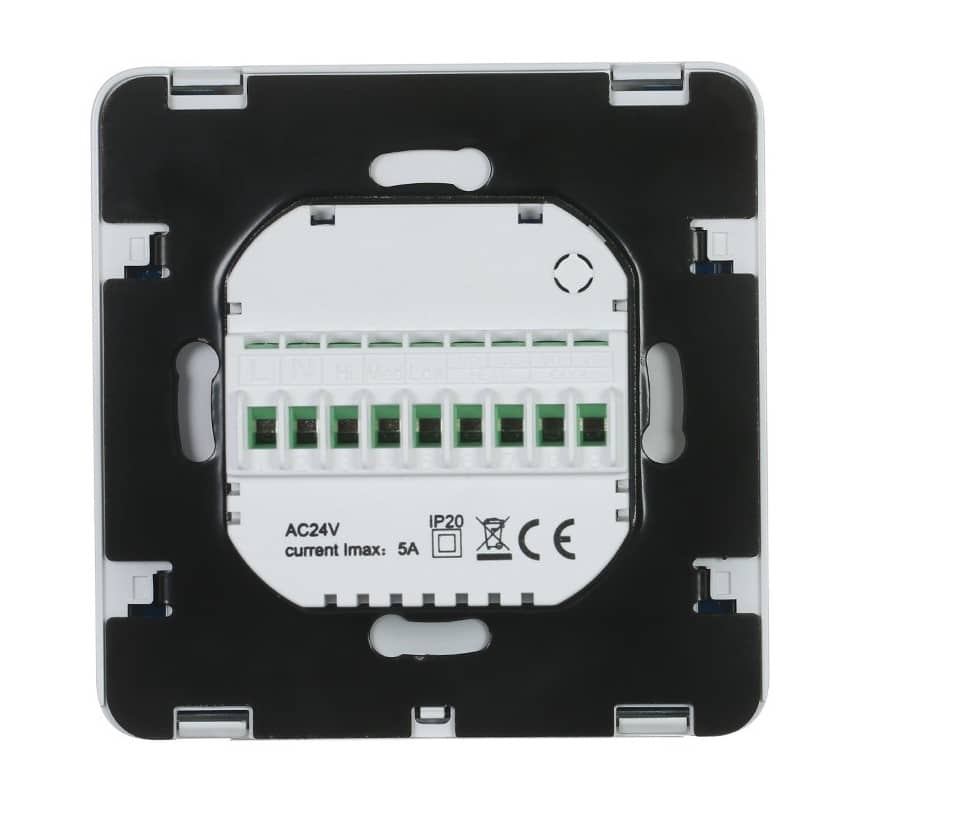 Ο θερμοστάτης συνδέεται στο δίκτυο (230V) και διαθέτει επαφές για έλεγχο 3 ταχυτήτων ανεμιστήρα (+ Auto), καθώς και επιλογές λειτουργίας Ψύξης, Θέρμανσης και Αερισμού, ιδανικό για Fan Coil & κεντρικά κλιματιστικά.