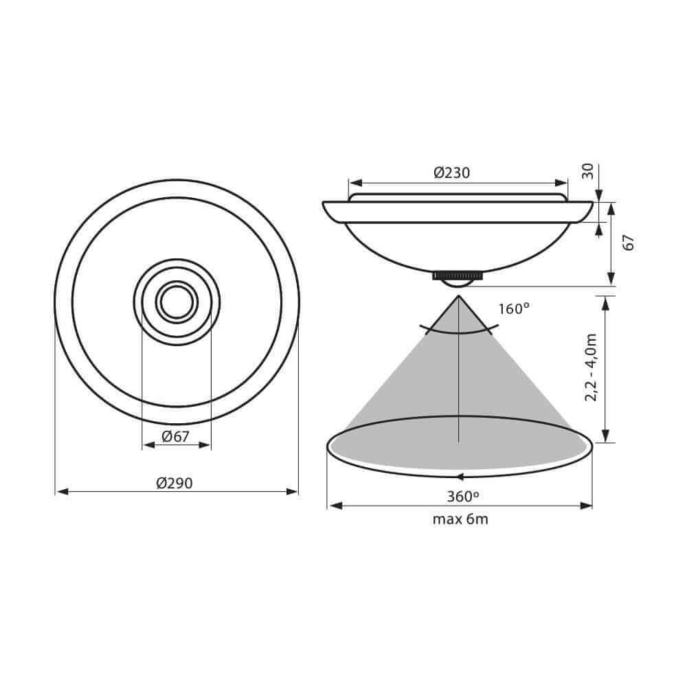 Το LEDA LED 12W ενεργοποιεί αυτόματα τον φωτισμό όταν ανιχνεύσει κίνηση μέσα στην εμβέλειά του και τον απενεργοποιεί μόλις ο χώρος μείνει κενός. Ο αισθητήρας καλύπτει 360° με μέγιστη απόσταση ανίχνευσης έως 6 μέτρα, προσφέροντας απόλυτη ευκολία και εξοικονόμηση ενέργειας.